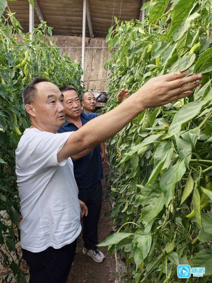 柳臣(前)到大棚察看蔬菜生長(zhǎng)情況。