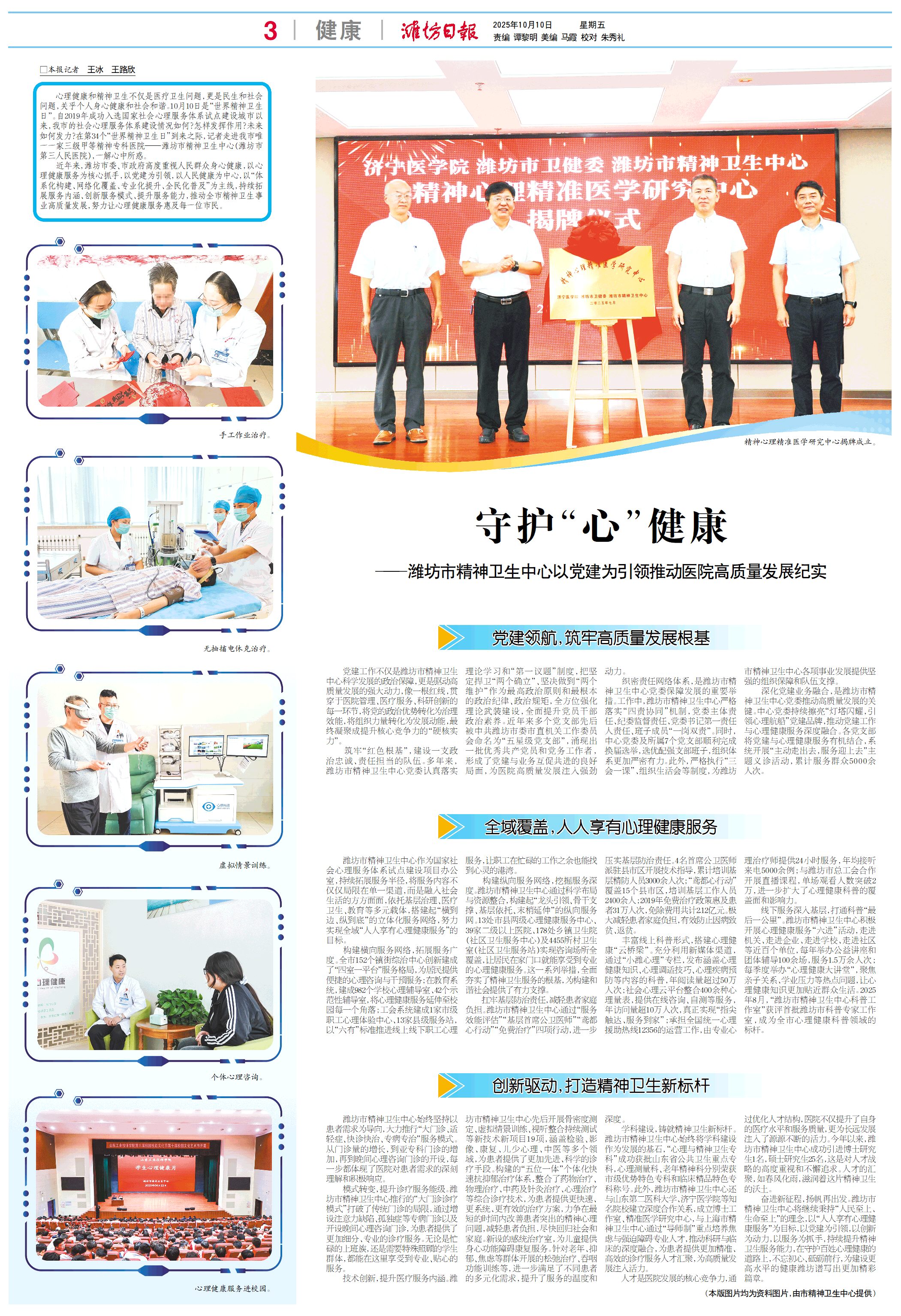 新派訊 心理健康和精神衛(wèi)生不僅是醫(yī)療衛(wèi)生問題,更是民生和社會問題,關乎個人身心健康和社會和諧。10月10日是“世界精神衛(wèi)生日”。自2019年成功入選國家社會心理服務體系試點建設城市以來,我市的社會心理服務體系建設情況如何?怎樣發(fā)揮作用?未來如何發(fā)力?在第34個“世界精神衛(wèi)生日”到來之際,記者走進我市唯一一家三級甲等精神??漆t(yī)院——濰坊市精神衛(wèi)生中心(濰坊市第三人民醫(yī)院),一解心中所惑。