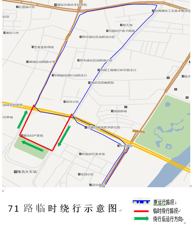 新派訊 日前,記者從濰坊市公交集團(tuán)了解到,受城區(qū)健康西街向陽路路口附近道路施工影響,為消除右轉(zhuǎn)安全隱患,自10月13日起,濰坊市公交集團(tuán)對(duì)71路局部走向臨時(shí)調(diào)整。