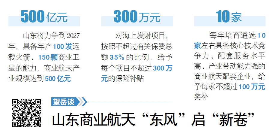 據(jù)介紹,瞄準(zhǔn)鞏固?hào)|方航天港的“海上發(fā)射優(yōu)勢(shì)”和全省的“液體火箭試驗(yàn)優(yōu)勢(shì)”,山東將著力提升火箭制造能力和新型火箭研發(fā)能力,推動(dòng)火箭航班化發(fā)射。對(duì)海上發(fā)射項(xiàng)目,按照不超過(guò)有關(guān)保費(fèi)總額35%的比例,給予每個(gè)項(xiàng)目不超過(guò)300萬(wàn)元的保險(xiǎn)補(bǔ)貼。突出“航天應(yīng)用+大數(shù)據(jù)+人工智能”融合發(fā)展,對(duì)符合相關(guān)規(guī)定的衛(wèi)星數(shù)據(jù)算力交易場(chǎng)景和衛(wèi)星應(yīng)用大模型產(chǎn)品,分別給予每個(gè)不超過(guò)500萬(wàn)元和100萬(wàn)元獎(jiǎng)補(bǔ)。